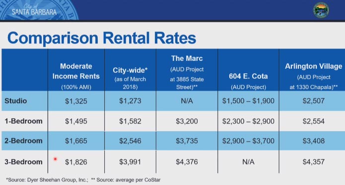 That’s lower than the current market rates for most two-bedroom apartments in Santa Barbara, new or not, and a lot of one-bedroom apartments.